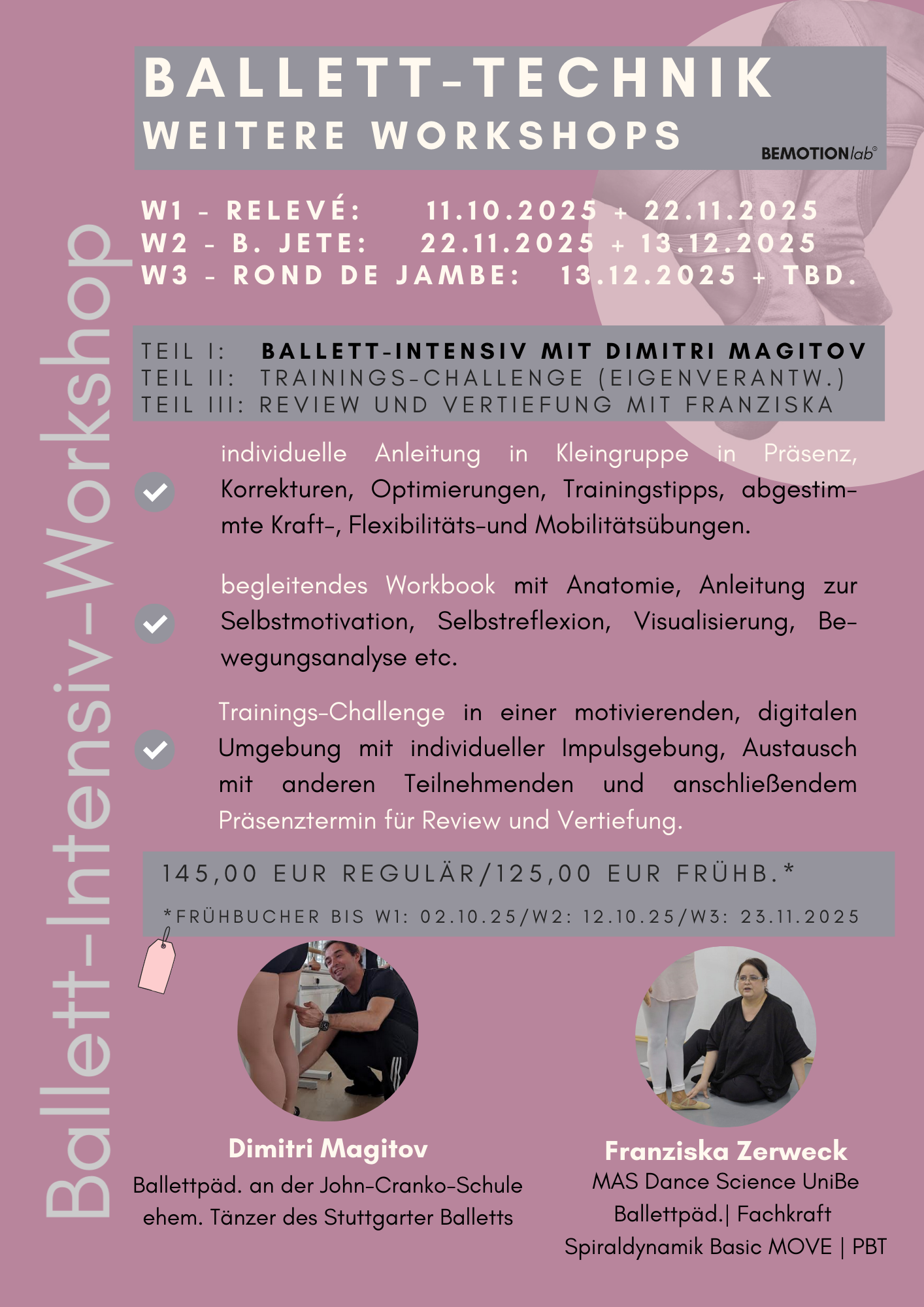 Die Intensiv-Workshops sind für Personen konzipiert, die gerne fokussiert an speziellen Ballett-/Tanzthemen arbeiten möchten, um diese im Anschluss in ihr Ballett-/Tanztraining zu integrieren. Die kleine Gruppengröße von max. 8 Teilnehmenden ermöglicht den Dozenten, auf die individuellen Voraussetzungen und Fragestellungen der einzelnen Personen eingehen zu können.