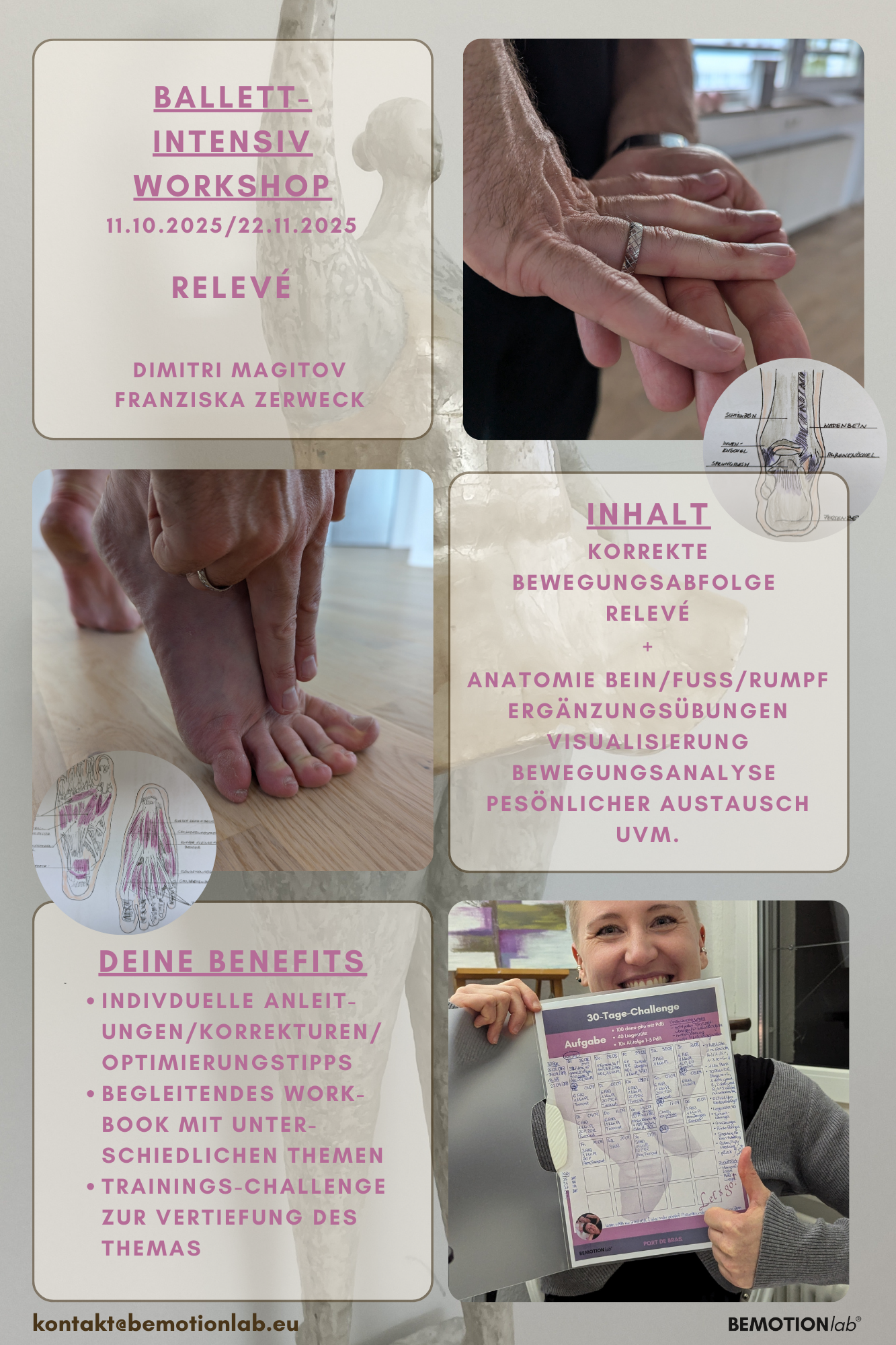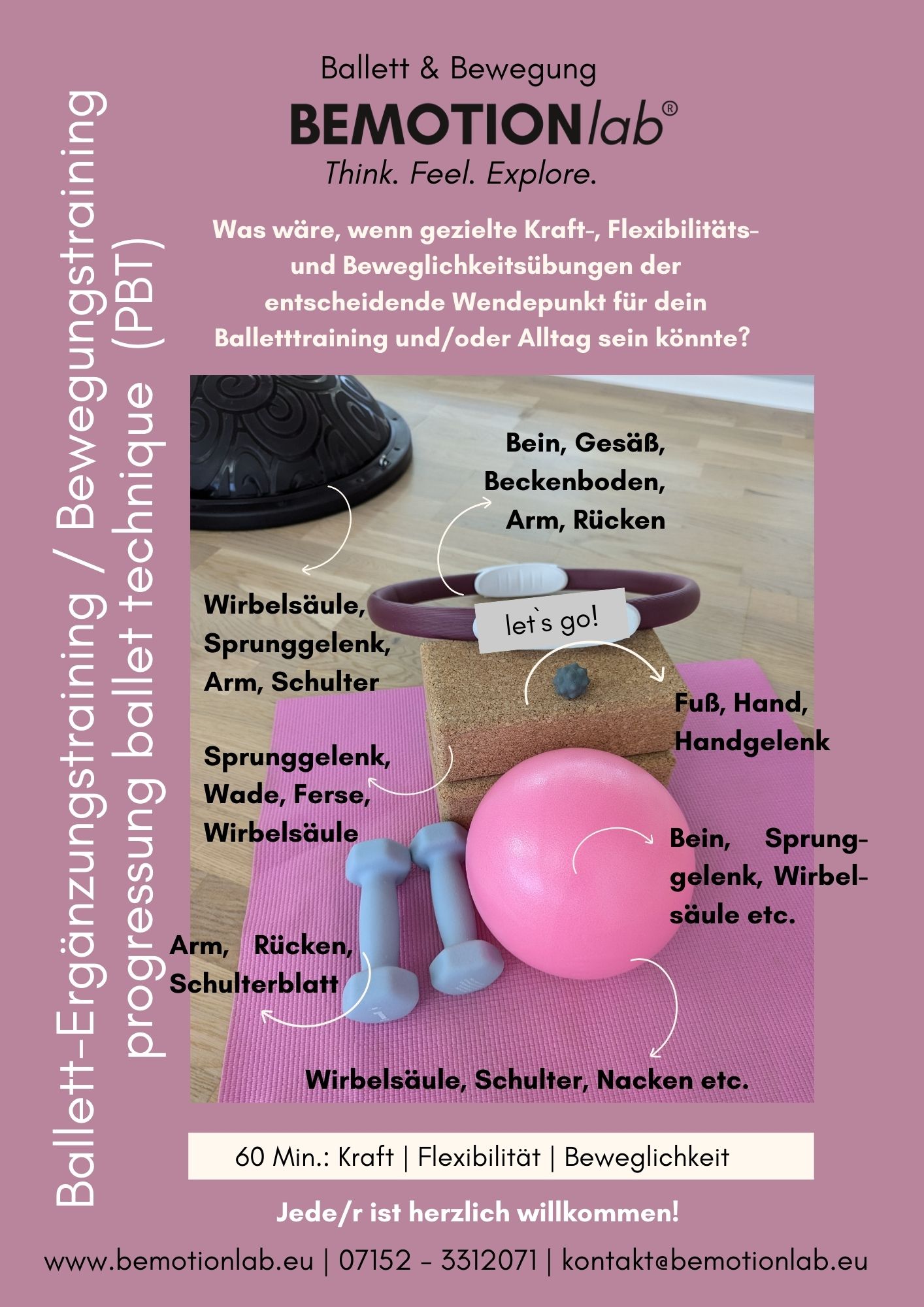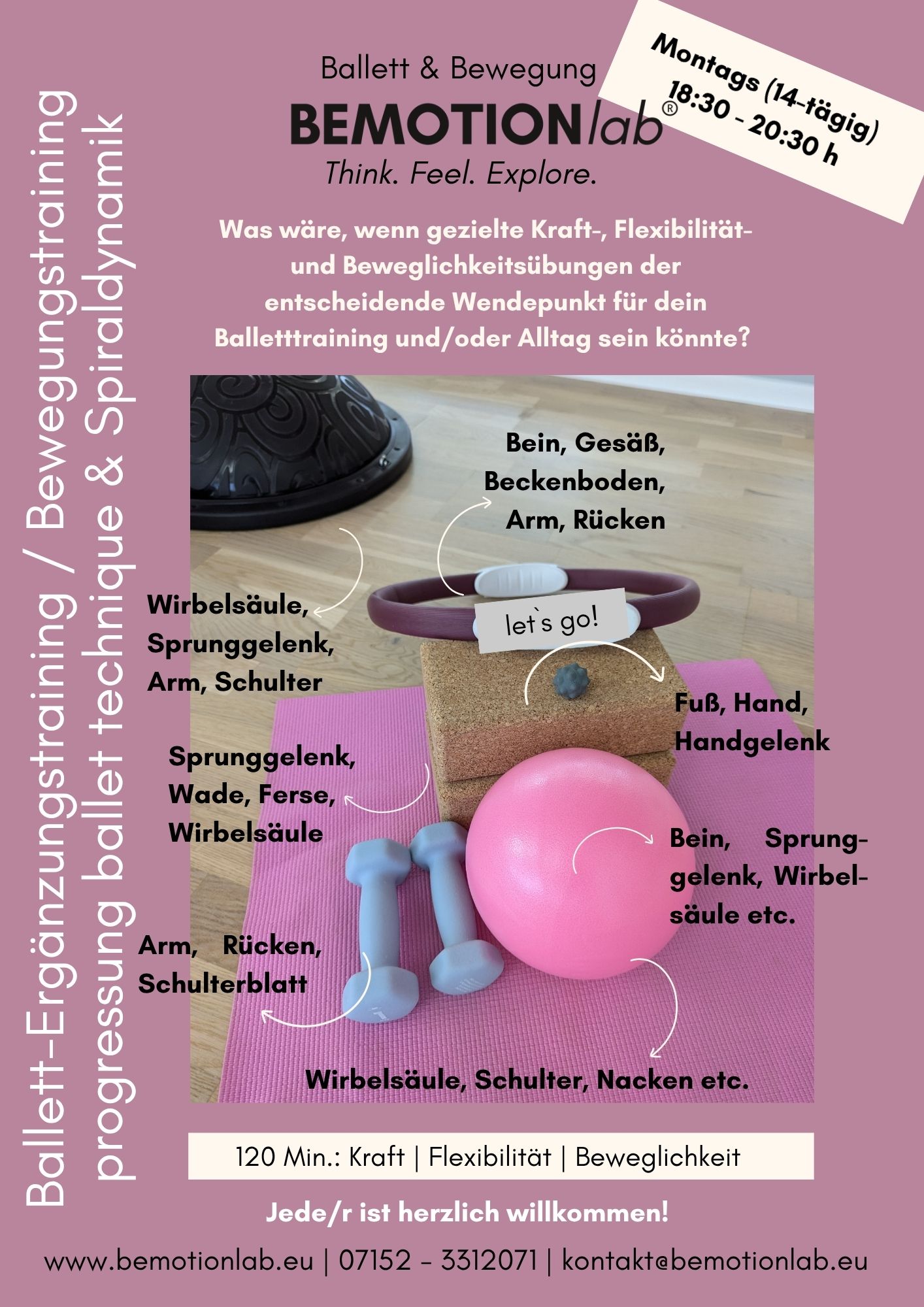 Zusammen mit den Dozenten und anderen Teilnehmenden erarbeitest du dir dein individuelles Bewegungsrepertoire, erlernst ergänzende Übungen für dein persönliches Ballett-Training sowie eine alltagstaugliche Integration in dein Leben außerhalb des Ballettsaals. Die Übungen kommen aus unterschiedlichen Bewegungskonzepten wie PBT (Progressing Ballet Technique), Pilates, Spiraldynamik sowie angewandten Sportwissenschaften und werden gezielt kombiniert und bewusst auf dein Können abgestimmt.